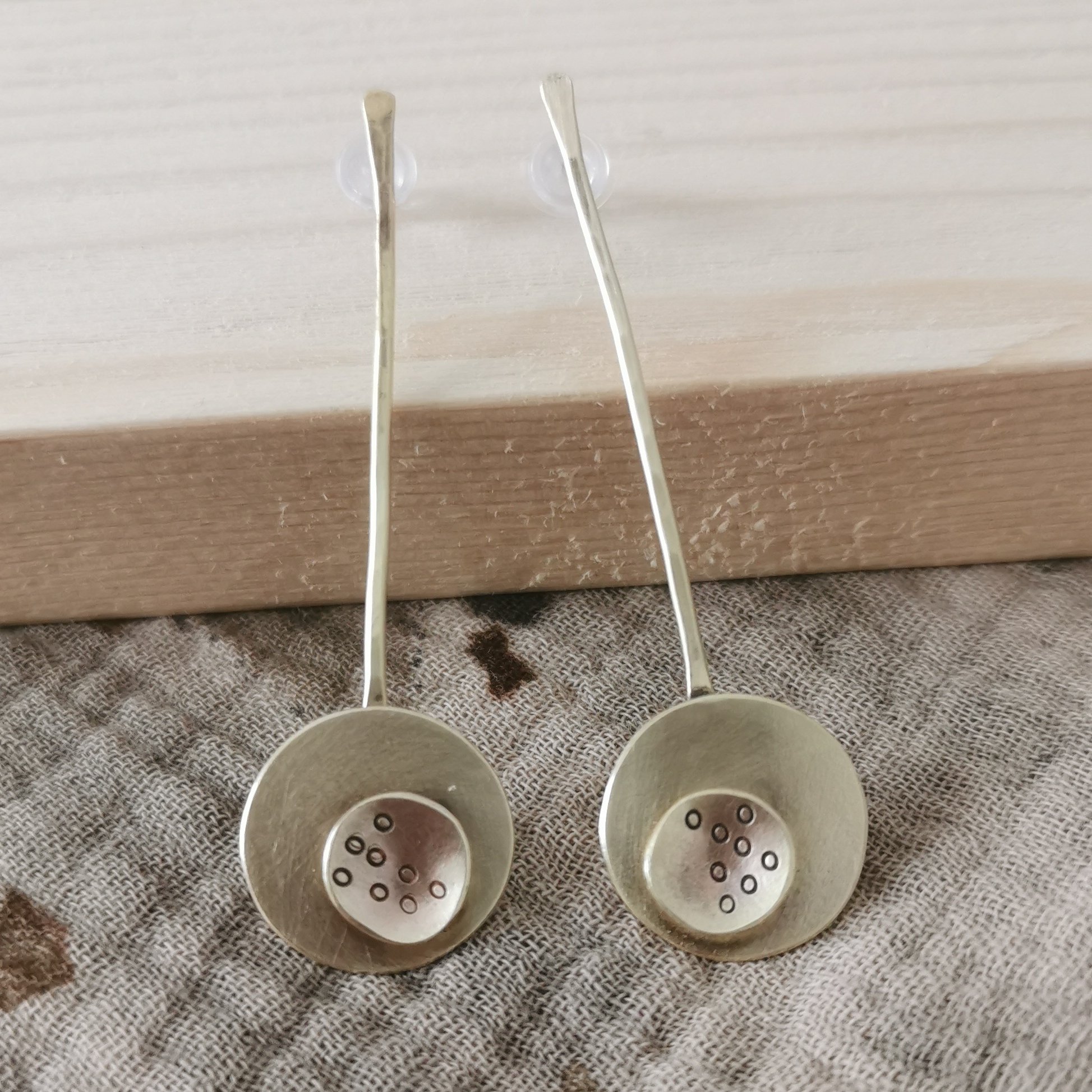 Boucles d'oreilles en laiton patiné. Attache en argent. Longueur 5,5 cm. Diamètre du disque 1,6 cm. Vendu avec un tampon pour les nettoyer.