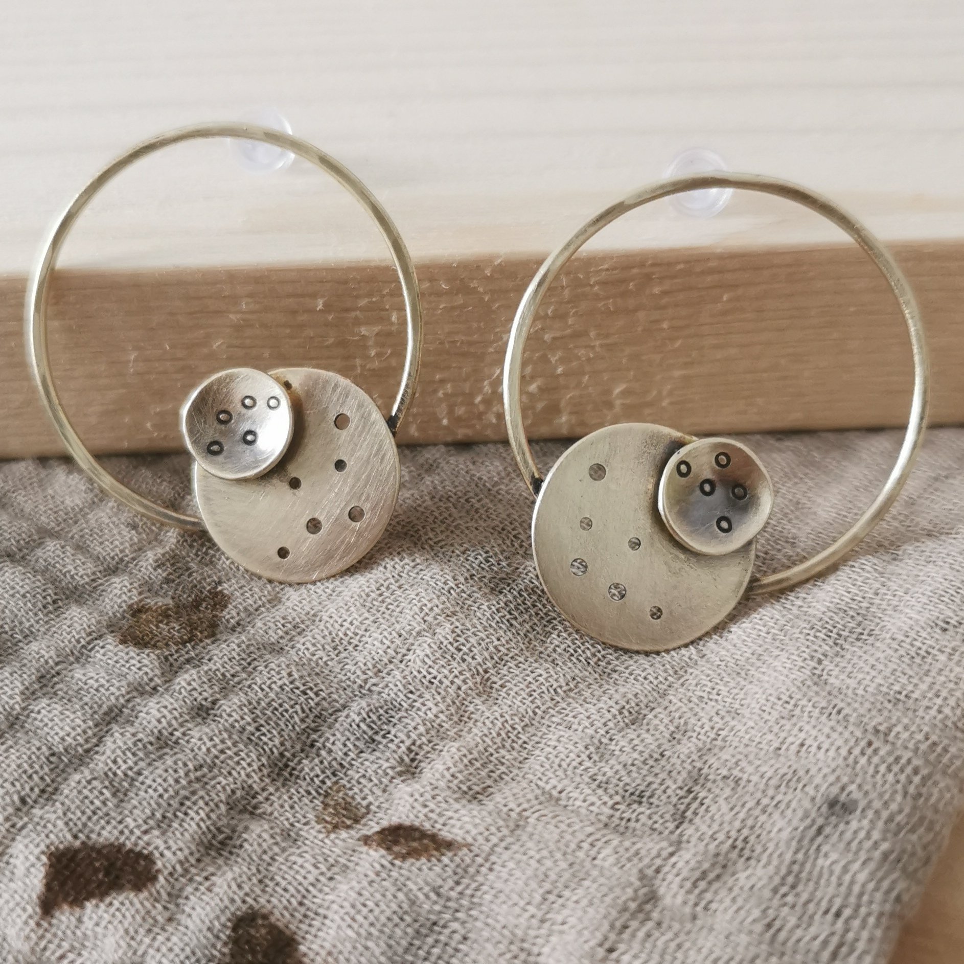 Boucles d'oreilles en laiton patiné. Attache en argent. Diamètre du cercle 3 cm. Hauteur totale 3,5 cm.