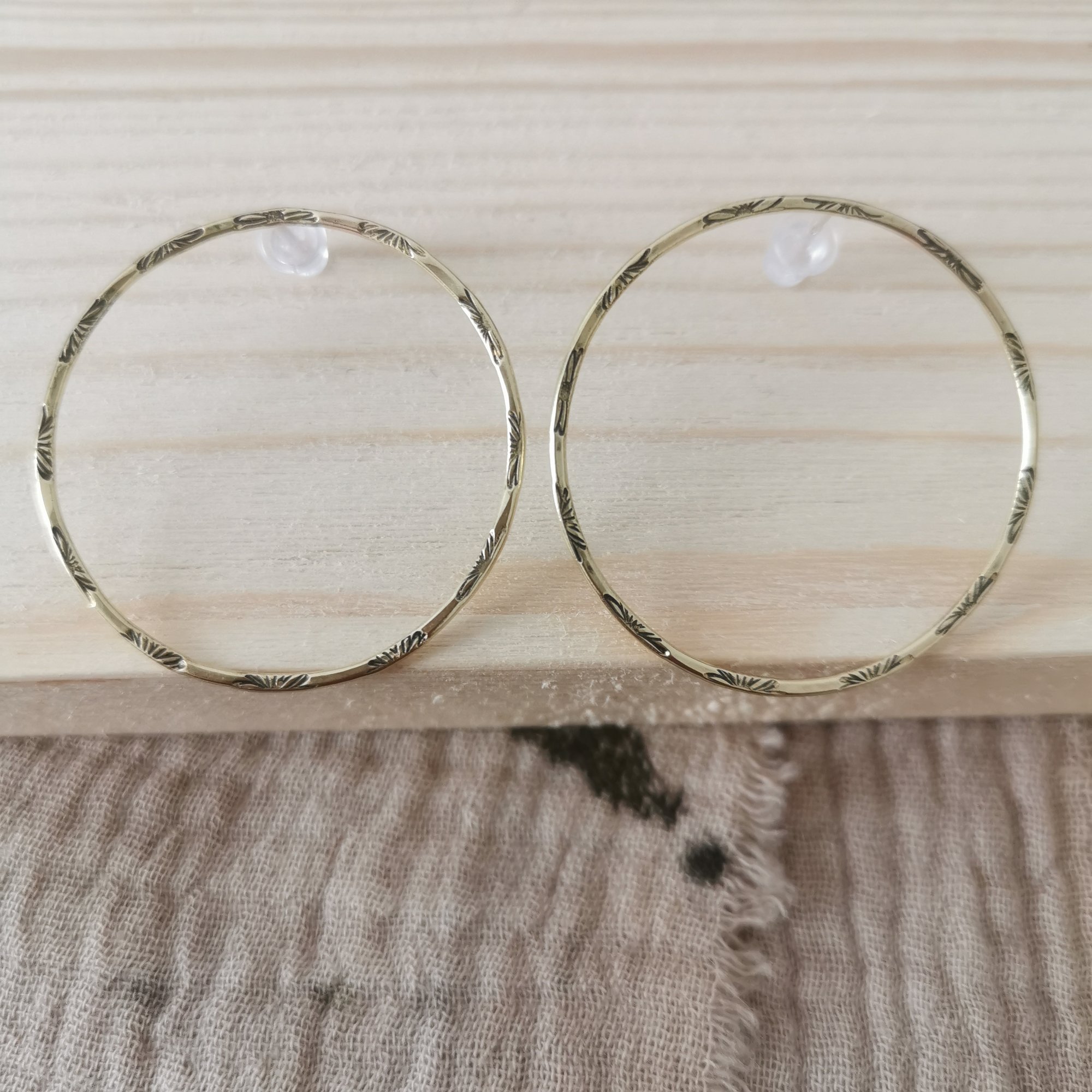 Boucles d'oreilles en laiton patiné. Attache en argent. Diamètre 3,5 cm.