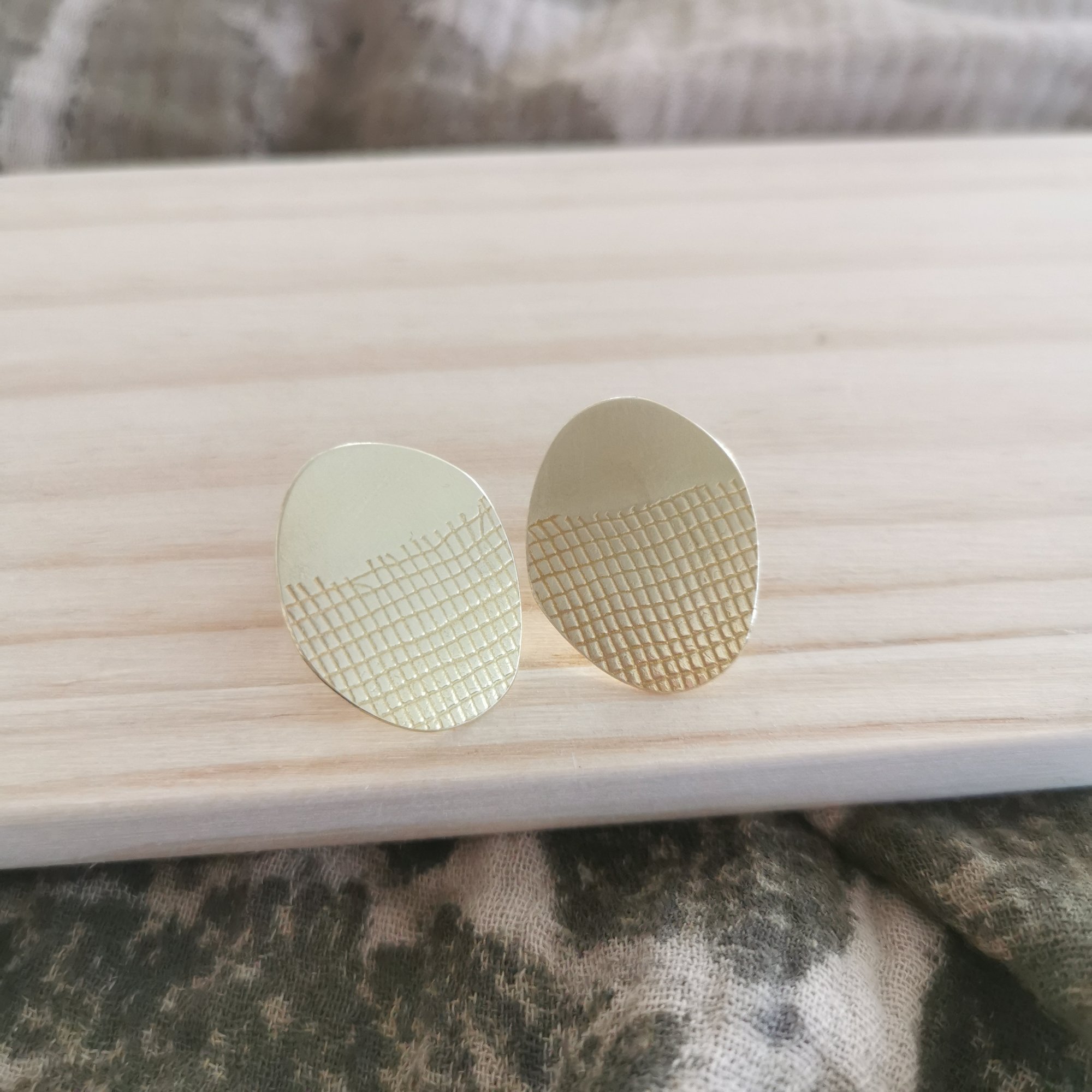 Boucles d'oreilles en laiton, découpées et décorées à la main.